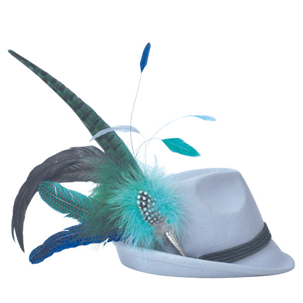 Eine extravagante grün-blaue Kombination aus gefärbten Fasanenfedern und Hahnenschlappenfedern. Das Federgesteck wird an den Hut angesteckt und ist ein schönes Trachtenaccessoire für das Münchner Oktoberfest.
