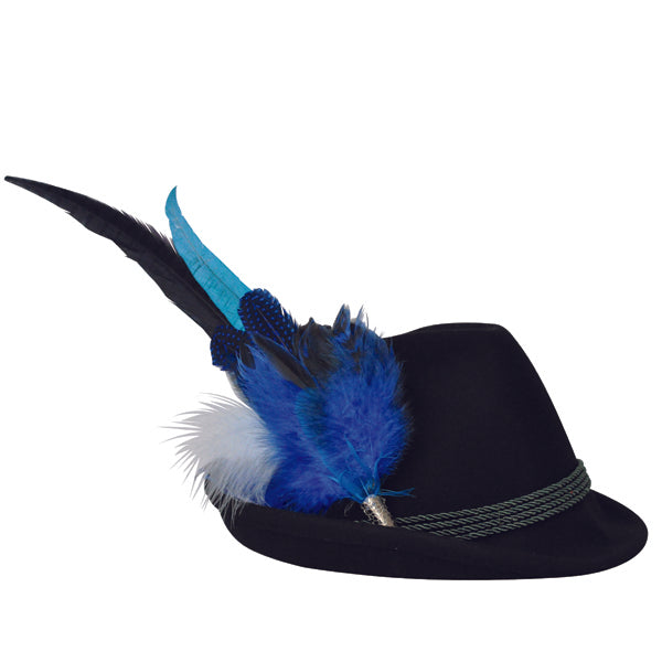 Eine originelle Kombination aus gefärbten Fasanenfedern und gefärbten Hahnenschlappenfedern. Das Federgesteck wird an den Hut angesteckt und ist ein schönes Trachtenaccessoire für das Münchner Oktoberfest. Material: Hahnenschlappen-, Fasanenfedern, Metall-Hülse. Größe: L ca. 35cm.