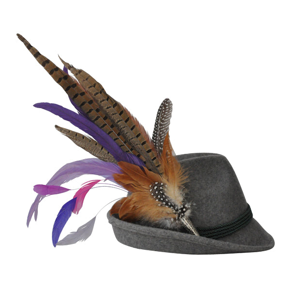 Eine elegante Kombination aus Fasanenfedern und gefärbten Hahnenschlappenfedern. Das Federgesteck wird an den Hut angesteckt und ist ein schönes Trachtenaccessoire für das Münchner Oktoberfest.