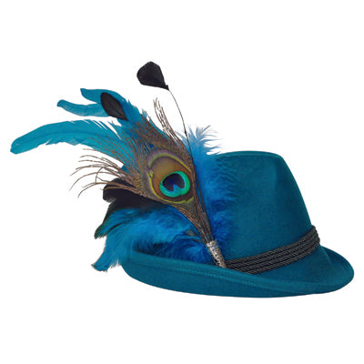 Eine prunkvolle Kombination aus gefärbten Hahnenschlappenfedern und einer Pfauenfeder. Das Federgesteck wird an den Hut angesteckt und ist ein schönes Trachtenaccessoire für das Münchner Oktoberfest.