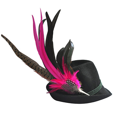 Eine originelle Kombination aus dunkelgrünen Nautr-Hahnenschlappen und Fasanenfedern mit pink gefärbten Hahnenschlappen. Das Federgesteck wird an den Hut angesteckt und ist ein schönes Trachtenaccessoire für das Münchner Oktoberfest.